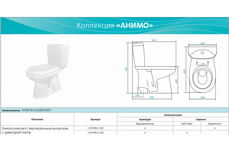 Унитаз-компакт "Анимо" ( вып. В ПОЛ, дюропласт. с 1-кн. арм.(Порт), нижн. подв.)